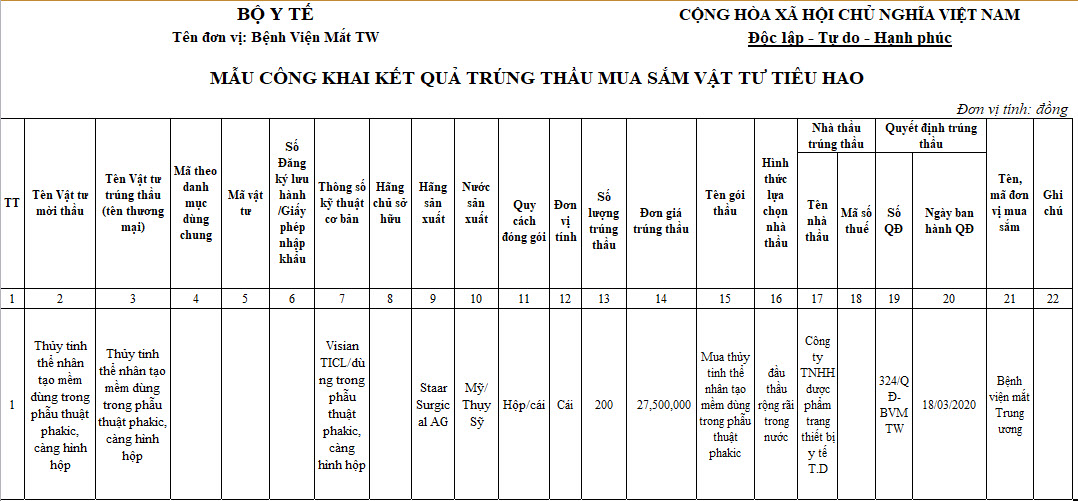 Bệnh viện Mắt TW - Công khai kết quả đầu thầu mua sắm vật tư tiêu hao Thủy tinh thể 2020