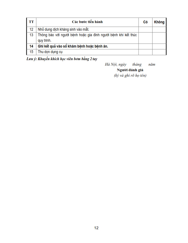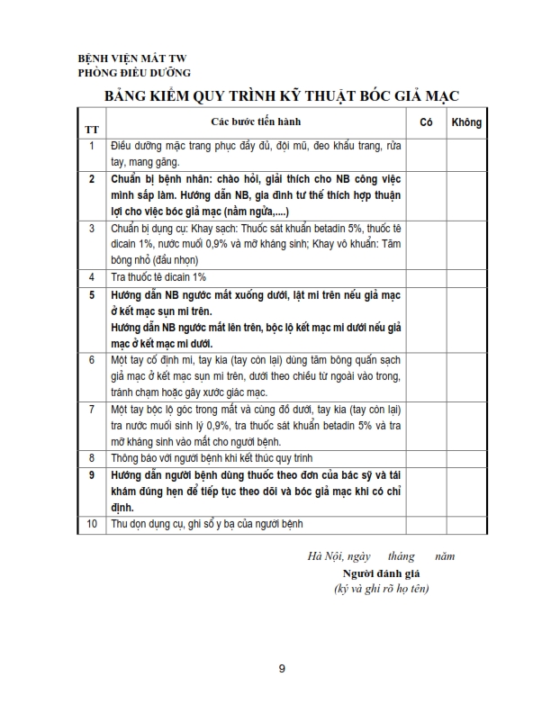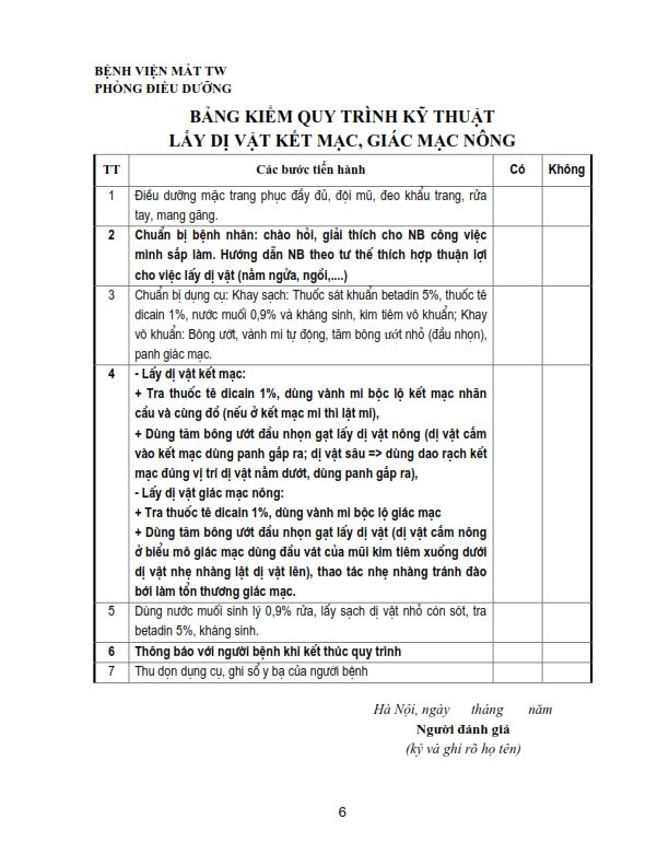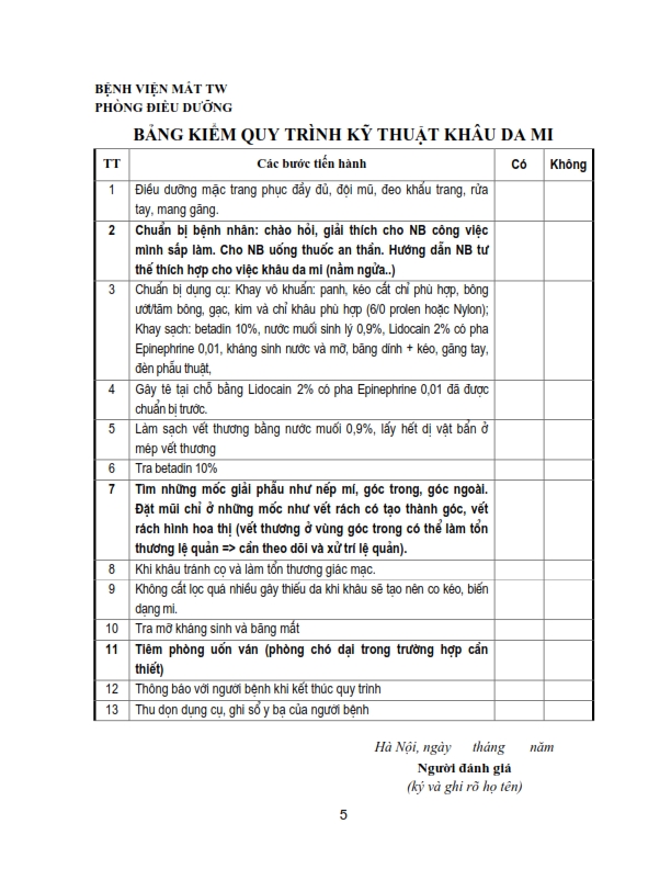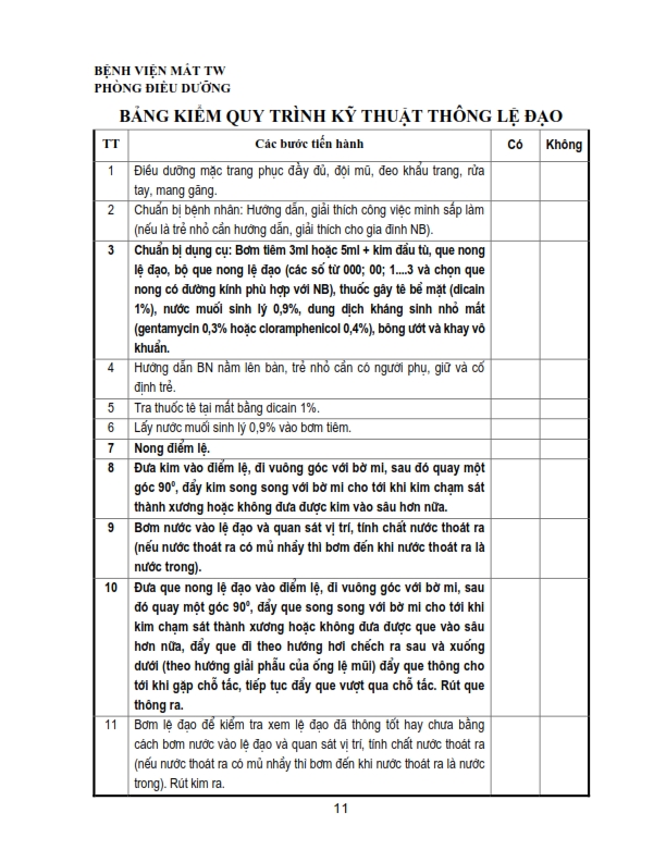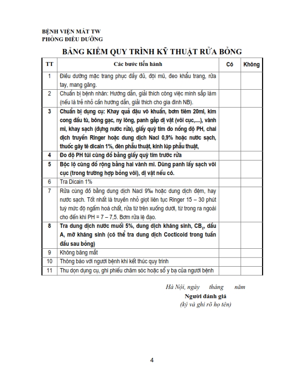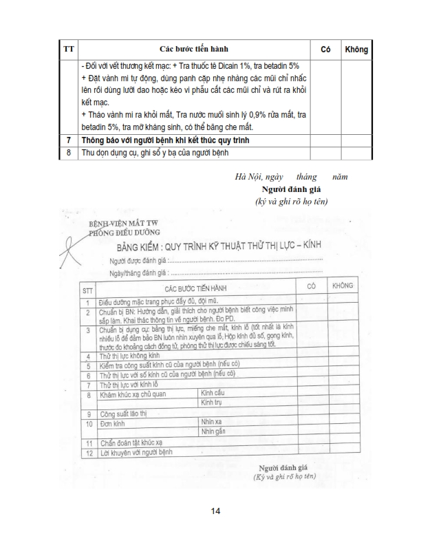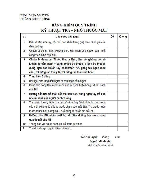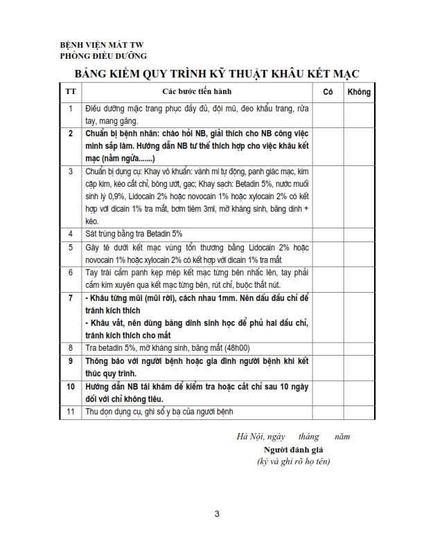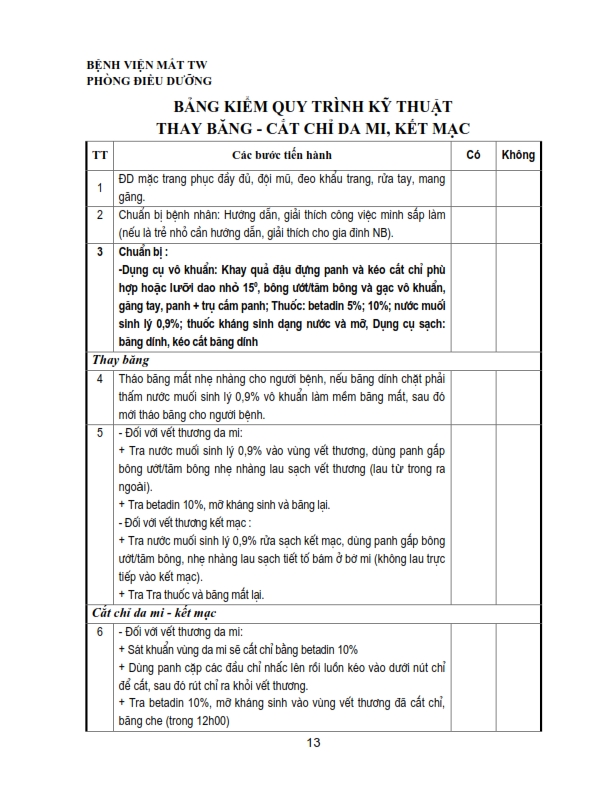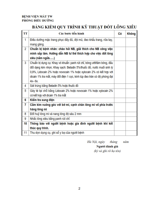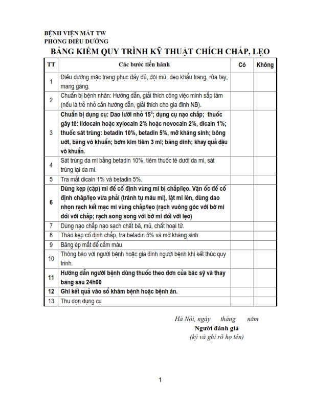 Bảng kiểm quy trình kỹ thuật chích chắp, lẹo, đốt lông xiêu, khâu kết mạc, rửa bỏng, khâu da mi, lấy di vật kết giác mạc nông, nặn tuyến bờ mi .....