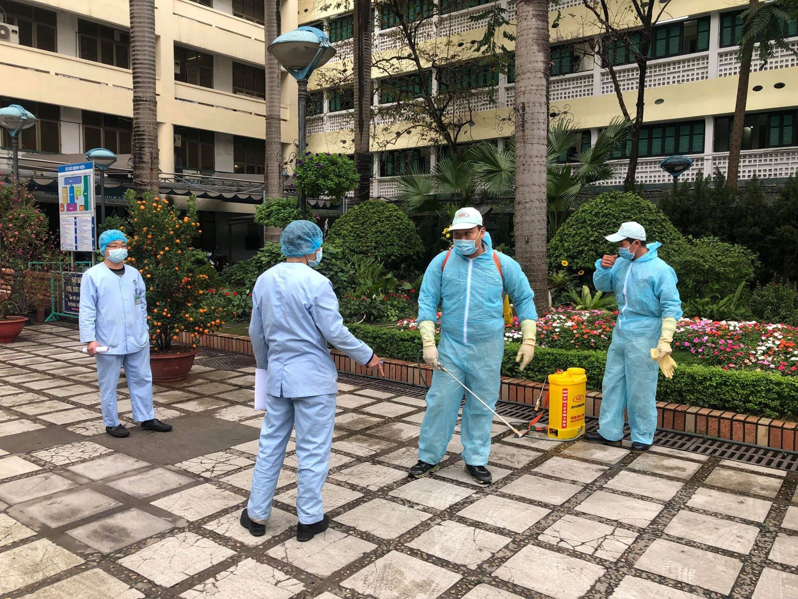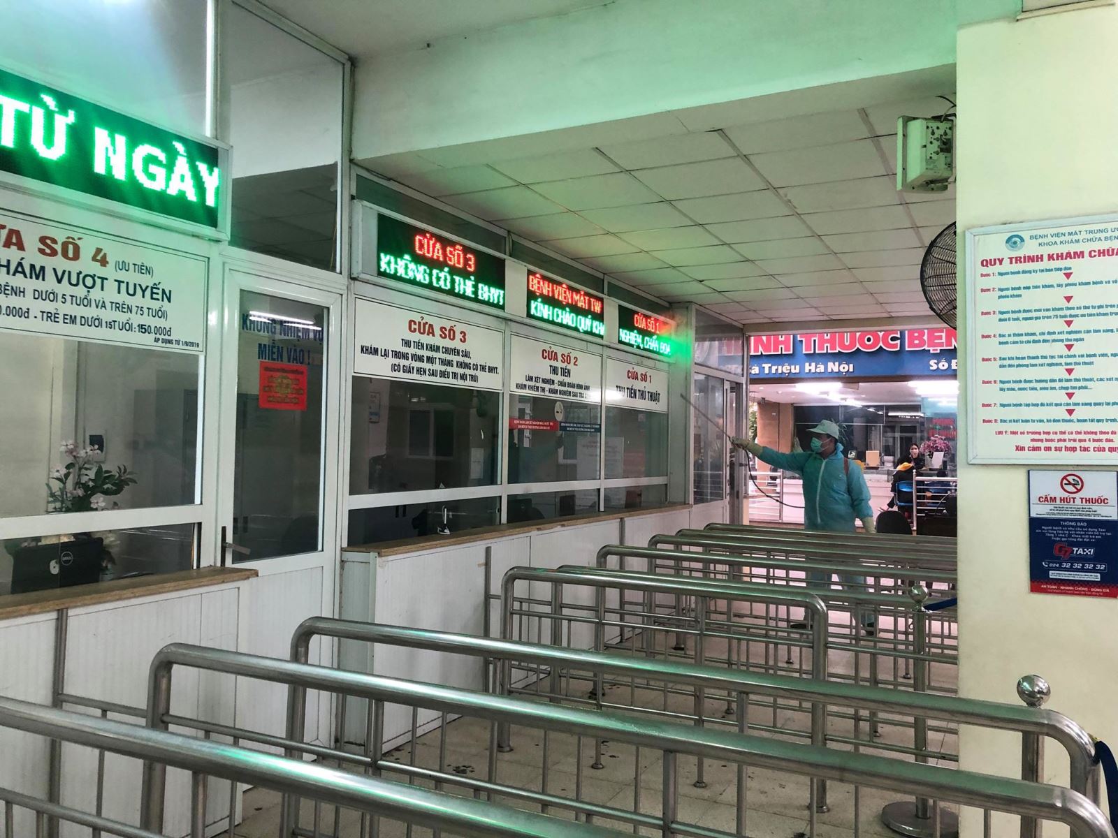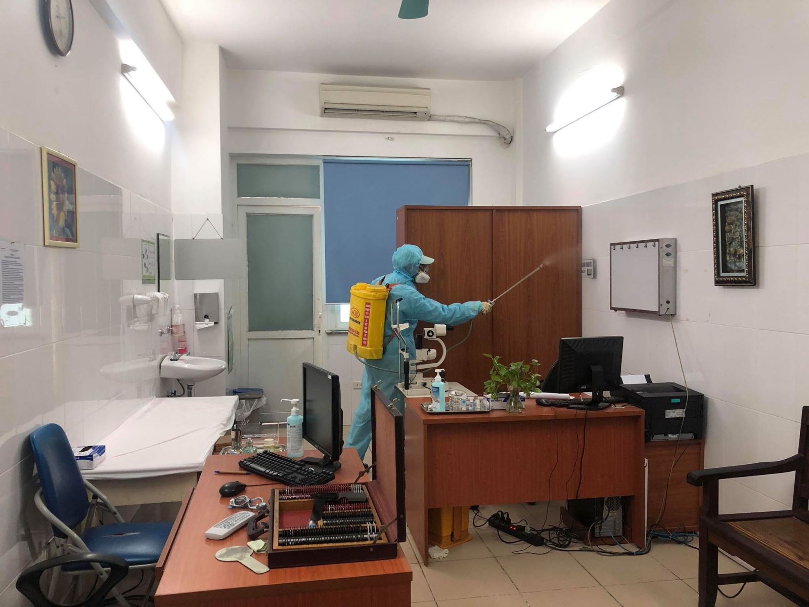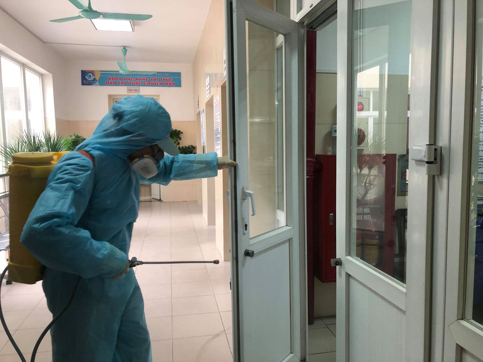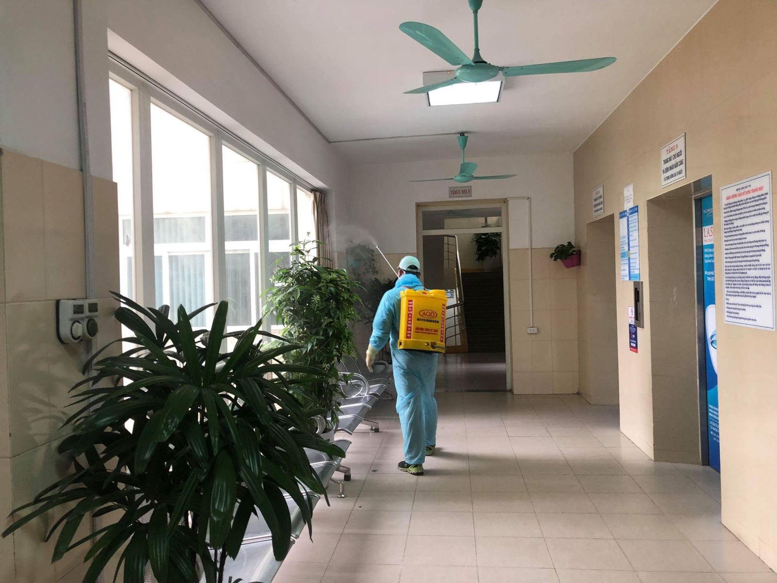 Bệnh viện đã tiến hành phun thuốc khử khuẩn bệnh viện bao gồm khu đón tiếp người bệnh, các khoa phòng làm việc, buồng bệnh, hành lang, cầu thang, sân vườn... để đảm bảo công tác phòng dịch hiệu quả nhất