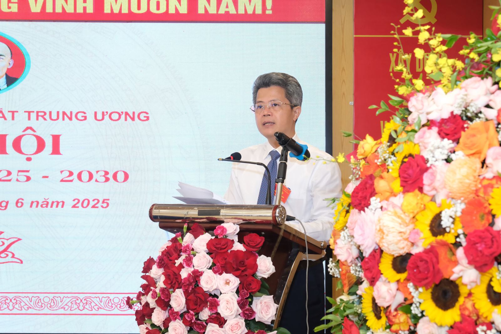 Đồng chí Trần Trung Kiên thay mặt Đoàn thư ký lên trình bày dự thảo Nghị quyết Đại hội Đảng bộ Bệnh viện Mắt Trung ương nhiệm kỳ 2025 – 2030 với số Đảng viên tán thành là 130 Đảng viên chính thức .