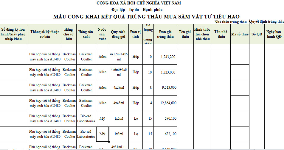 Bệnh viện Mắt TW - Công khai kết quả trúng thầu mua sắm vật tư tiêu hao năm 2020