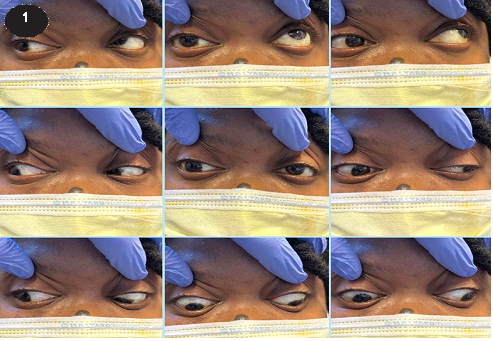 Khám bệnh: có thể có lồi mắt và/hoặc lệch trục nhãn cầu kèm theo sụp mi. Trong các trường hợp TNP mắc phải, 86% có biểu hiện sụp mi và hầu hết đều có rối loạn chức năng vận động.