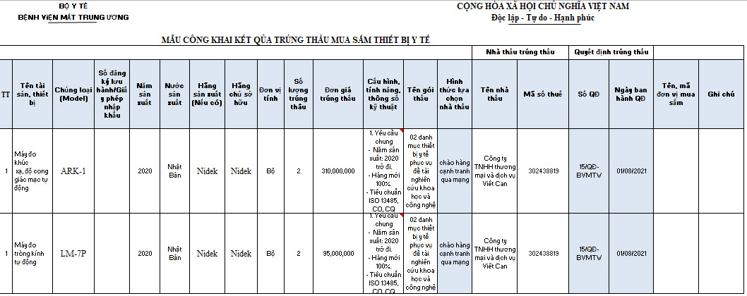 Kết quả lựa chọn nhà thầu gói thầu số 1: Mua sắm thủy tinh thể nhân tạo Podeye