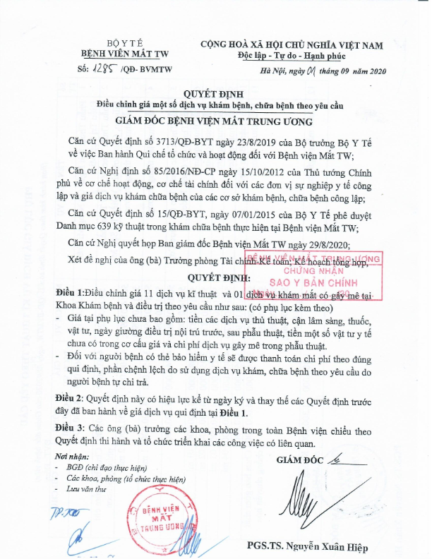 Quyết định ban hành giá dịch vụ Laser femtosecond điều trị tật khúc xạ