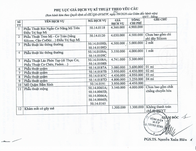 Điều chỉnh giá 11 dịch vụ kỹ thuật và 01 dịch vụ khám Mắt có gây mê tại Khoa khám bệnh và điều trị theo yêu cầu.