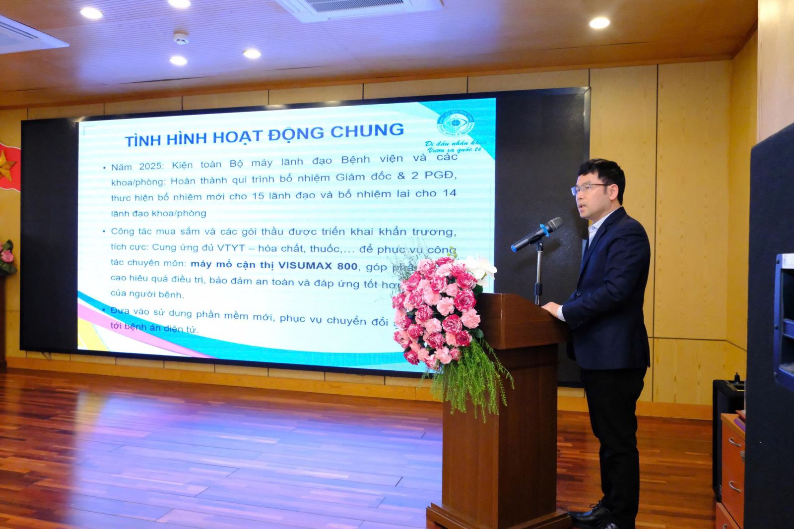 TS. Hoàng Anh Tuấn – Phó Giám đốc phụ trách kinh tế – thay mặt lãnh đạo Bệnh viện báo cáo khái quát kết quả hoạt động nổi bật trong năm 2025. Theo đó, Bệnh viện đã kiện toàn tổ chức bộ máy lãnh đạo, đổi mới công tác đấu thầu, bảo đảm đầy đủ vật tư y tế, thuốc và hóa chất phục vụ khám chữa bệnh. Các chỉ tiêu chuyên môn đều đạt và vượt kế hoạch; công tác chuyển đổi số, cải tiến chất lượng dịch vụ tiếp tục được đẩy mạnh; đời sống vật chất, tinh thần của cán bộ, viên chức, người lao động không ngừng được nâng cao.