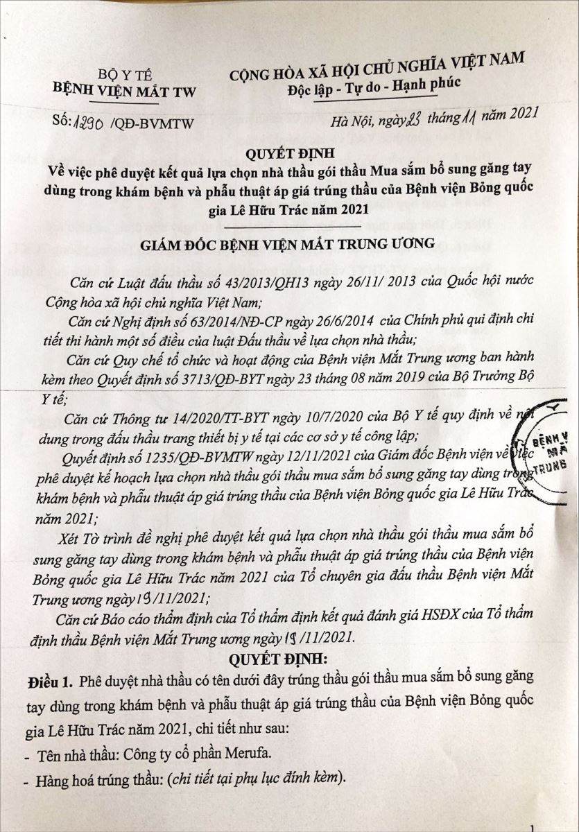 Quyết định về việc phê duyệt lựa chọn nhà thầu gói thầu mua sắm bổ sung găng tay dùng trong khám bệnh và phẫu thuật, áp giá trúng thầu của Bệnh viện Bỏng Quốc gia Lê Hữu Trác năm 2021