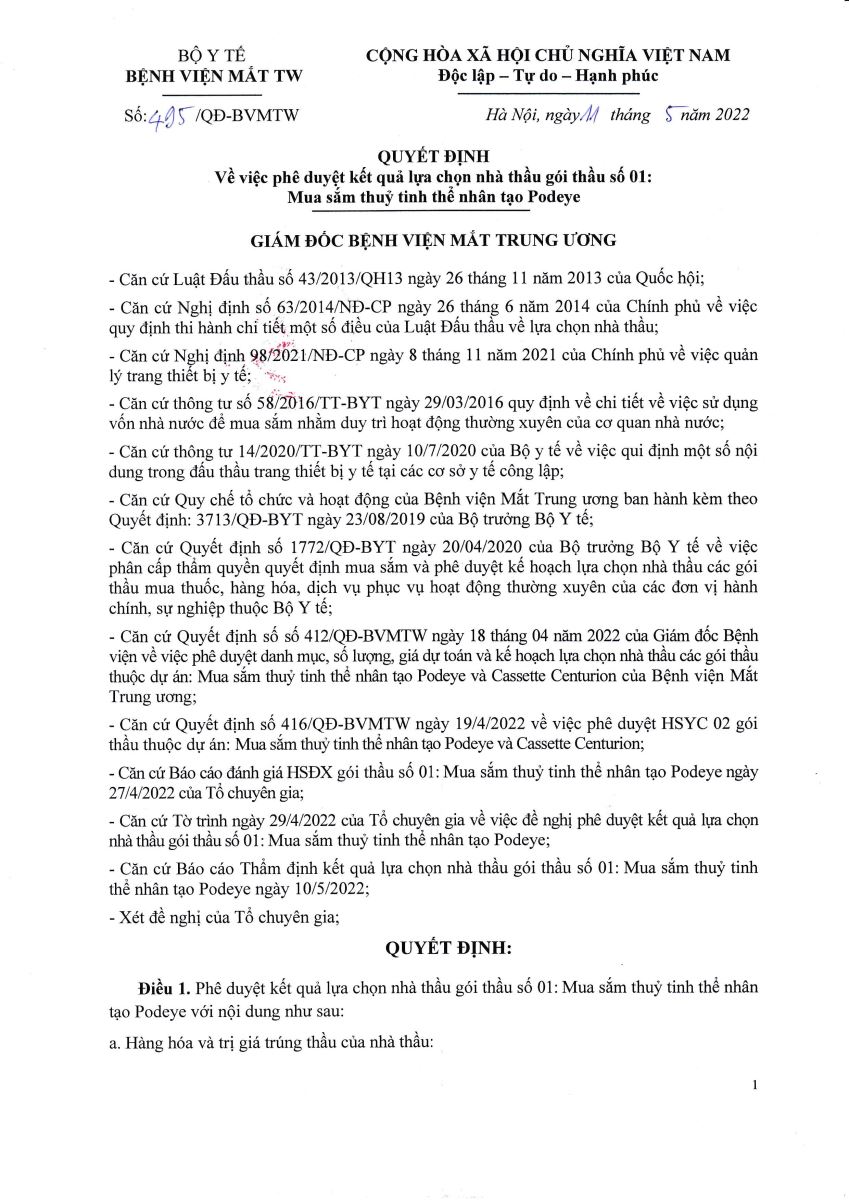 Kết quả lựa chọn nhà thầu gói thầu số 1: Mua sắm thủy tinh thể nhân tạo Podeye
