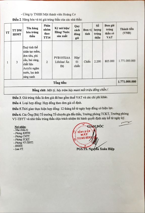 Kết quả trúng thầu: Thuỷ tinh thể nhân tạo mềm, đơn tiêu, phi cầu, hai càng, chất liệu Acrylic ngậm nước, lọc ánh sáng xanh