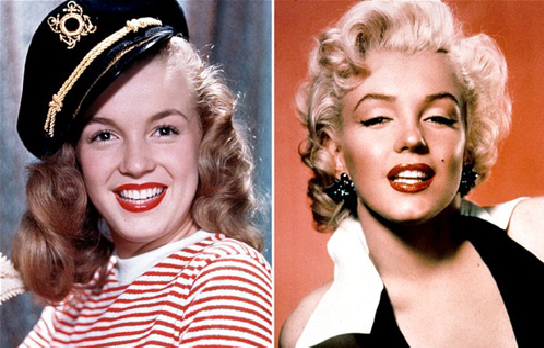 Marilyn Monroe năm 1945 (trái) và Marilyn Monroe những năm 1950 (phải) sau khi thực hiện cuộc phẫu thuật chỉnh sửa cằm vào năm 1949. Huyền thoại điện ảnh đã nhận được nhiều vai diễn để đời sau đó