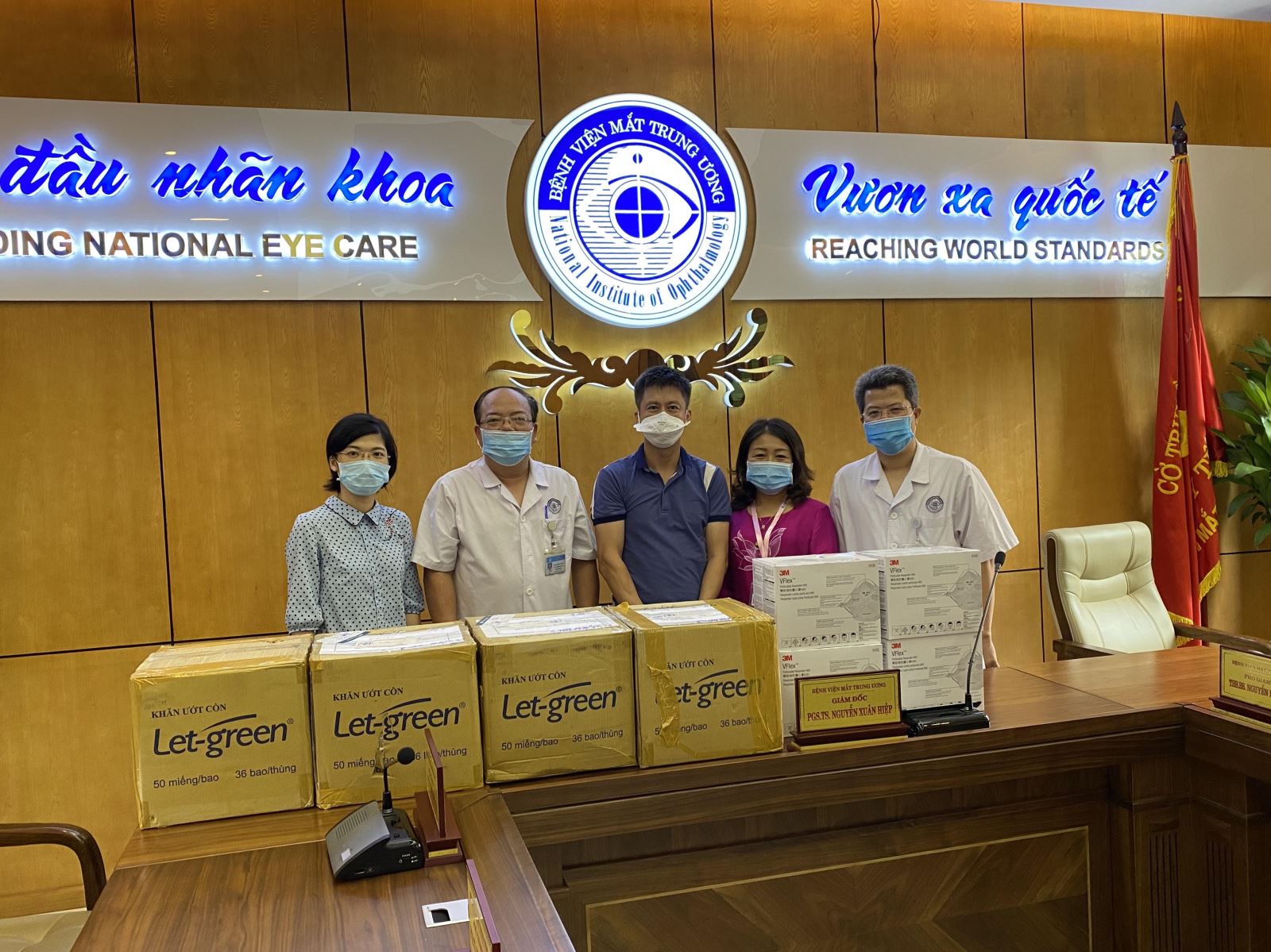 Sáng ngày 20/8/2020, phòng CTXH đã cùng với phó Giám đốc Bệnh viện PGS-TS Phạm Ngọc Đông làm thủ tục tiếp nhận 200 Khẩu trang 3 M VFlex 9015 -N95, 144 gói khăn ướt cồn Let-green do Công ty TRB CHEMEDICA trao tặng Bệnh viện Mắt Trung ương trong công tác ứng phó, phòng chống dịch COVID-19.