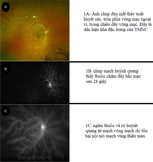 Ảnh chụp đáy mắt thường và chụp mạch huỳnh quang của một bệnh nhân thiếu máu nhãn cầu