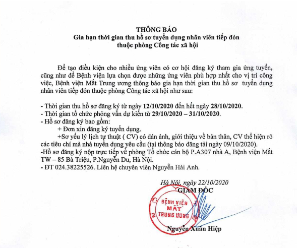Để tạo điều kiện cho nhiều ứng viên có cơ hội đăng ký tham gia ứng tuyến , cũng như để Bệnh viện lựa chọn những ứng viên phù hợp nhất cho vị trí công việc, Bệnh viện Mắt TW thông báo gia hạn thời gian thu hồ sơ tuyển dụng như sau:
