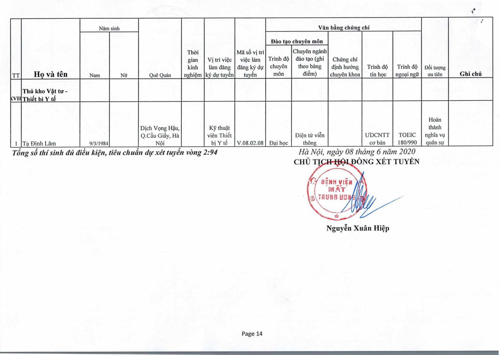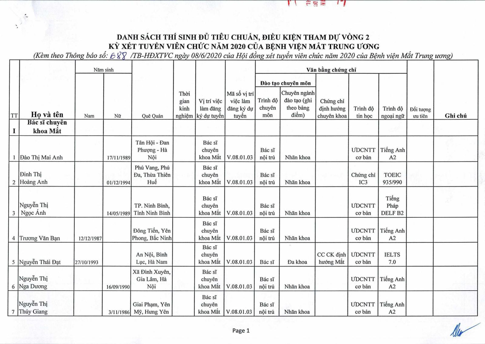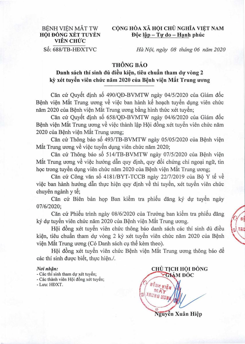 Thông báo - Danh sách thí sinh đủ điều kiện, tiêu chuẩn tham dự vòng 2 kỳ xét tuyển viên chức 2020 của Bệnh viện Mắt Trung ương