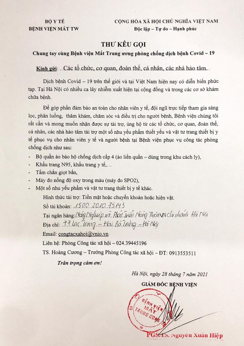 Thư kêu gọi chung tay cùng BV Mắt TW chống dịch Covid-19