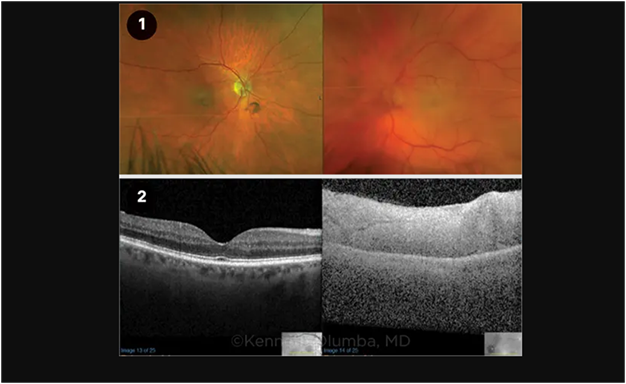 OCT hoàng điểm của mắt phải bình thường trong khi có phù võng mạc lan tỏa với bệnh lý hoàng điểm giữa cấp tính ở trung tâm mắt trái.