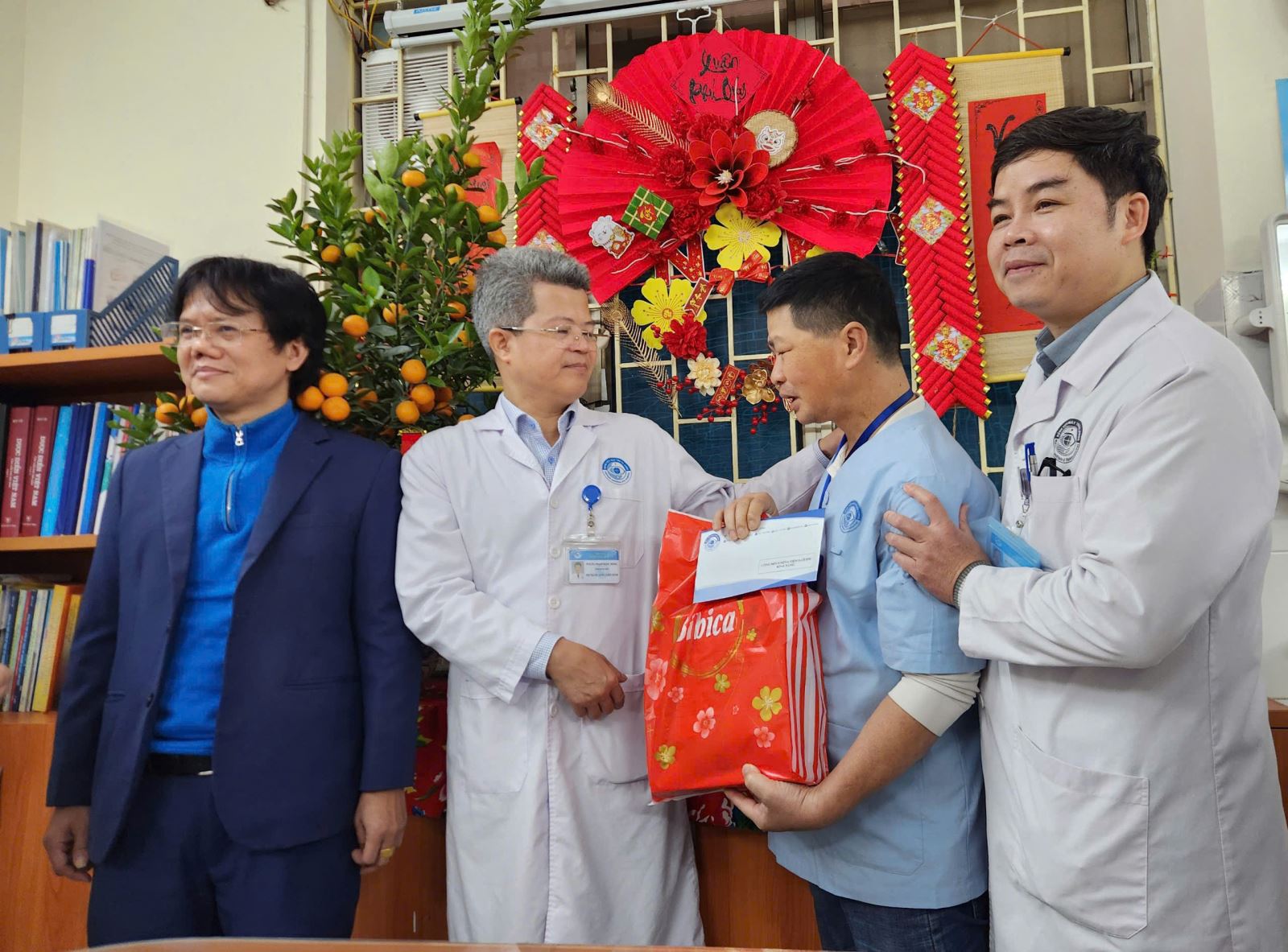 Cùng ngày 24/01/2025, TS. Nguyễn Văn Huy, Chủ tịch Công đoàn Bệnh viện, Ths. Phạm Thị Kim Đức, Phòng Công tác xã hội, cùng đại diện Lãnh đạo và màng lưới công tác xã hội của các khoa lâm sàng đã đến tặng quà, trò chuyện và động viên những người bệnh nặng ở lại điều trị trong dịp Tết Nguyên Đán. Hơn 100 phần quà (gồm bánh, kẹo, sữa) do Phòng Công tác xã hội kết nối đã được trao tặng cho người bệnh điều trị tại Bệnh viện trong dịp Tết với mong mỏi bệnh nhân cảm nhận được sự ấm áp, sự yêu thương, đủ đầy khi đón Tết tại Bệnh viện, sớm bình phục về với gia đình.