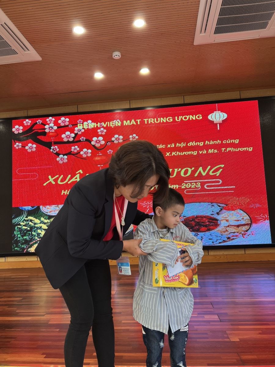 Nhân dịp Tết đến Xuân về, ngày 06/01/2023 chị Nguyễn Thị Mai Hương đại diện Nhóm Điều ước nhỏ đã trực tiếp trao tặng bệnh nhi đang điều trị nội trú tại Bệnh viện và nhân viên y tế khoa Mắt Trẻ em - những người trực tiếp chăm sóc đôi mắt cho bệnh nhi hàng ngày 120 chai dầu gội, 20 tube kem đánh răng và 20 lốc sữa Vinamilk để chăm sóc sức khoẻ, vệ sinh thân thể chuẩn bị đón năm mới - xuân về. Nhóm Điều ước nhỏ đã đồng hành cùng Phòng Công tác xã hội nhiều năm qua với những hoạt động nho nhỏ, dễ thương chăm sóc bệnh nhi và nhân viên y tế - đúng với tên gọi của nhóm.