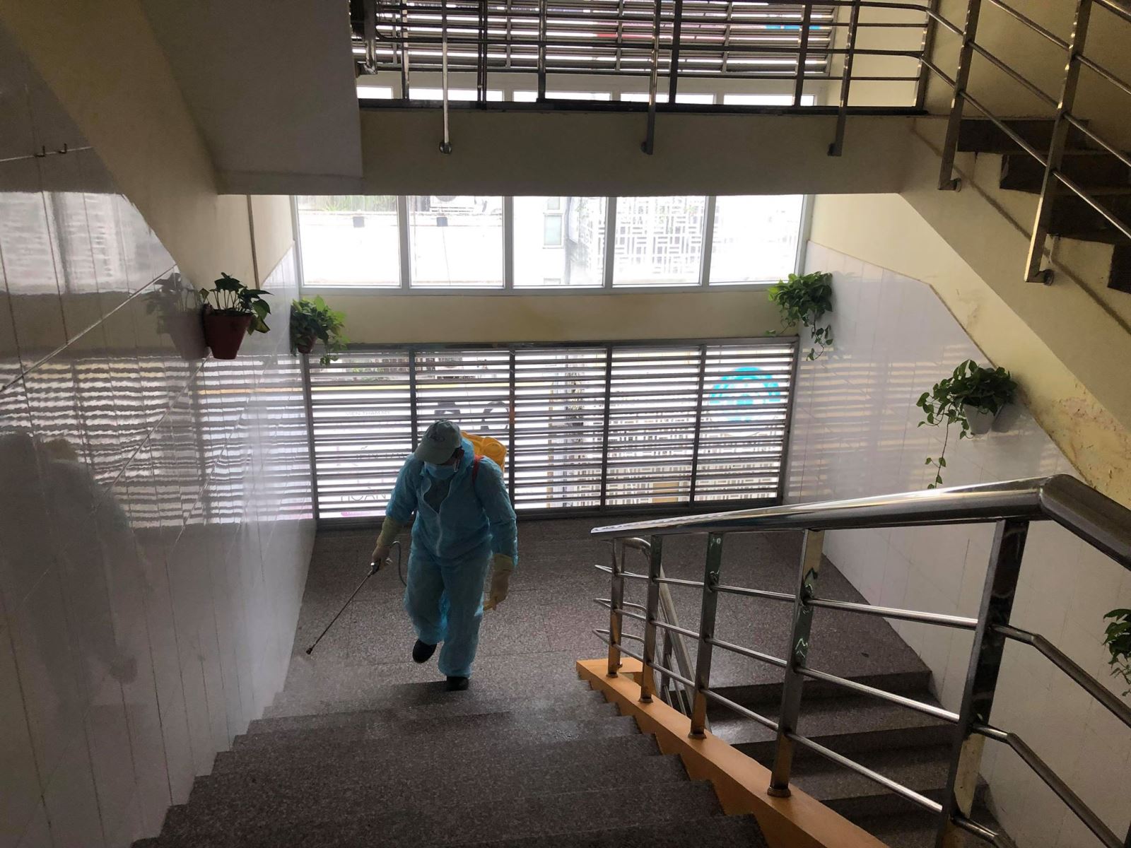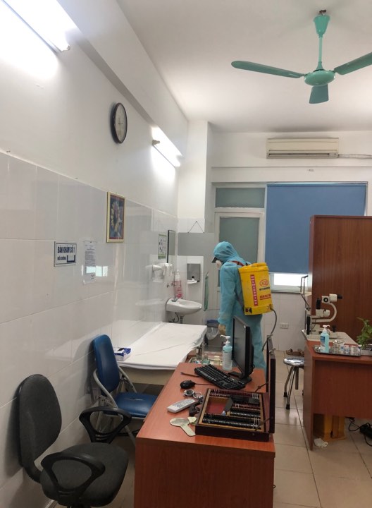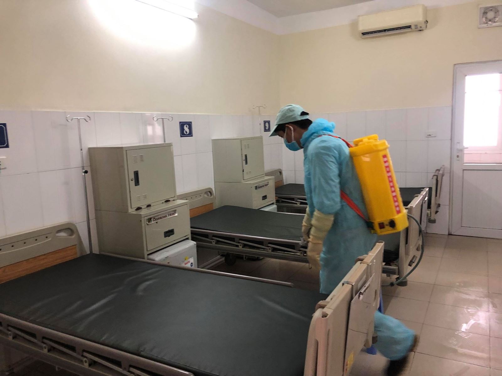 Bệnh viện đã tiến hành phun thuốc khử khuẩn bệnh viện bao gồm khu đón tiếp người bệnh, các khoa phòng làm việc, buồng bệnh, hành lang, cầu thang, sân vườn... để đảm bảo công tác phòng dịch hiệu quả nhất