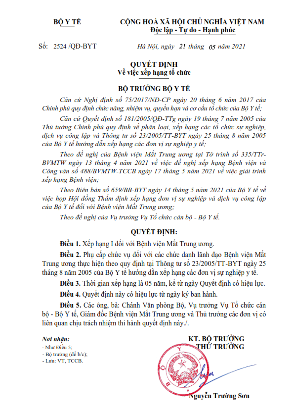 Tiếp theo đó, Bộ Y tế đã ban hành quyết định số 2524/ QQĐ-BYT do thứ trưởng Nguyễn Trường Sơn ký ngày 21/05/2021 công nhận Xếp hạng I đối với BVMTW.