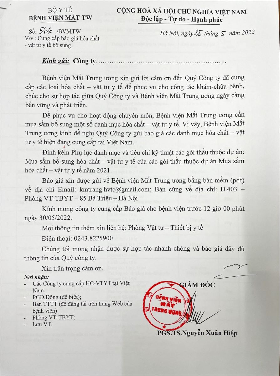 Thư mời báo giá mua sắm trang thiết bị y tế