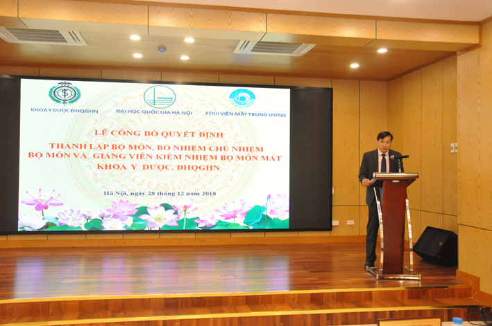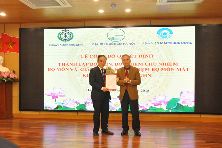 Trong niềm vinh dự và trách nhiệm cao tân Chủ nhiệm Bộ môn Mắt – Đại học Quốc gia PGS.TS Nguyễn Xuân Hiệp đã hứa sẽ sát cánh với đội ngũ cán bộ, giảng viên Bộ Mắt hoàn thành nhiệm vụ được giao. Cũng nhân dịp này danh sách 18 giảng viên thỉnh giảng cho Bộ môn Mắt – Khoa Y dược – Đại học quốc gia cũng được long trọng công bố. PGS.TS. Nguyễn Kim Sơn hiệu trưởng Đại học Quốc gia, GS. Lê Ngọc Thành trưởng khoa Y dược đã trao quyết định Chủ nhiệm bộ môn, quyết định giáo viên thỉnh giảng cho các giảng viên Bộ môn Mắt. Hai đồng chí cũng phát biểu thể hiện sự tin tưởng, kỳ vọng thông qua việc phát triển hệ thống bệnh viện thực hành khoa Y dược của Đại học Quốc gia sẽ có những bước tiến nhảy vọt, trở thành Trường Y dược thuộc Đại học Quốc gia, phù hợp với qui hoạch và tầm nhìn đã được Chính phủ thông qua