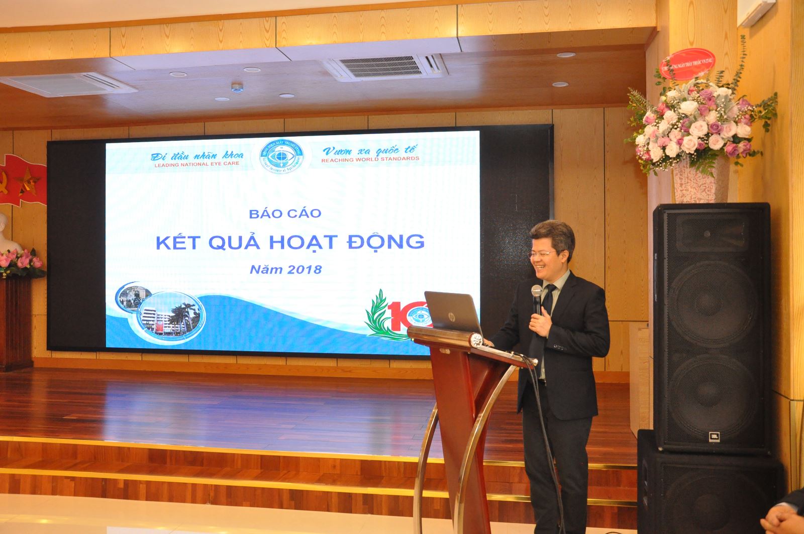 TS. Phạm Ngọc Đông, Phó Giám đốc Bệnh viện Mắt TW đã có báo cáo đánh giá ngắn gọn về các hoạt động nổi bật về hoạt động chuyên môn đến xây dựng môi trường xanh sạch đẹp, thân thiện với người bệnh, đặc biệt là thực hiện các mục tiêu hướng tới sự hài lòng của người bệnh. Trong năm 2018, nhiều đề tài nghiên cứu khoa học và trang thiết bị, kỹ thuật nhãn khoa hiện đại được Bệnh viện nghiên cứu, ứng dụng góp phần nâng cao chất lượng điều trị. Bên cạnh đó, Bệnh viện không ngừng cải cách thủ tục hành chính, các khâu đón tiếp, cơ sở vật chất… tạo điều kiện thuận lợi cho người bệnh khi đến khám và điều trị.Lãnh đạo Bệnh viện không ngừng xây dựng môi trường làm việc cho cán bộ nhân viên, xây dựng nếp sống văn hóa và tinh thần trong cơ quan… Đặc biệt hoạt động tuyên truyền phòng bệnh cũng như phối hợp chặt chẽ với các cơ quan báo chí, truyền thông tuyên truyền công tác phòng chống mù lào nâng cao nhận thức người dân về phòng va bảo vệ đôi mắt, tổ chức các hoạt động nhân đạo cộng đồng thông qua các đợt mổ lưu động tại cơ sở, chuyên giao khoa học kỹ thuật cho tuyến dưới….