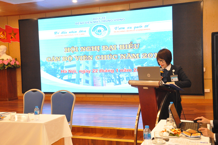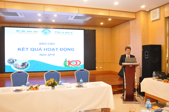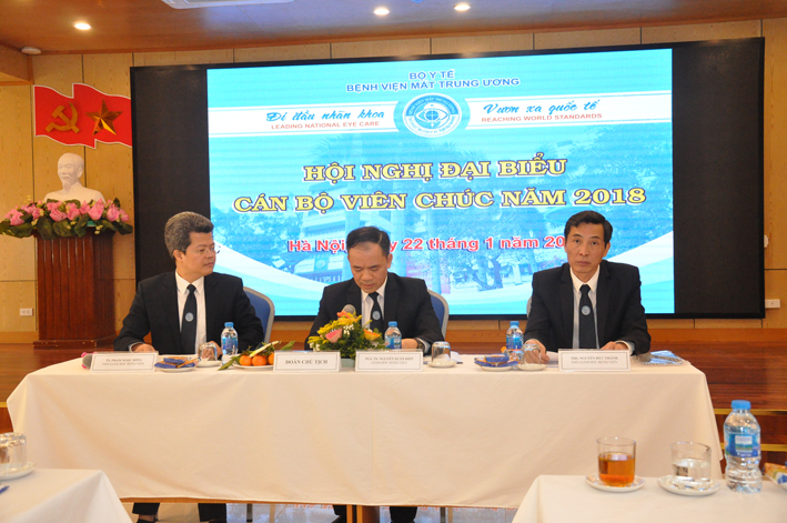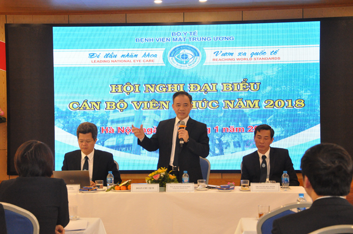 Mở đầu Hội nghị đồng chí Phạm Ngọc Đông – PGĐ Bệnh viện đã trình bày báo cáo tổng kết công tác năm 2018. Năm 2018 bệnh viện tiếp tục hoàn thành vượt mức các chỉ tiêu được giao với tổng số khám 520.000 bệnh nhân so với năm 2017 là 497.000, tổng số phẫu thuật các loại đạt gần 60.000 ca. Công tác xây dựng, cải tạo mặt bằng, tận dụng diện tích …đã làm thay đổi cơ bản diện mạo của bệnh viện. Chất lượng điều trị, công tác quản lý chất lượng ngày càng qui củ. Phong trào Xanh- Sạch-Đẹp , hướng tới sự hài lòng của người bệnh tiếp tục khởi sắc . Công tác đào tạo, nghiên cứu khoa học, hợp tác quốc tế , chỉ đạo tuyến ngày càng đa dạng và có thêm những thành tựu mới. Công tác Đảng đoàn, công tác xã hội và từ thiện có nhiều thành tích, góp phần không nhỏ vào thành công của Bệnh viện. Với những nỗ lực không mệt mỏi và thành tích không thể phủ nhận, Đoàn kiểm tra đánh giá chất lượng bệnh viện Bộ Y tế năm 2018 làm việc tại Bệnh viện Mắt TW đã xếp loại xuất sắc cho các kết quả hoạt động năm 2018 của bệnh viện Mắt TW với tổng điểm 4.16.