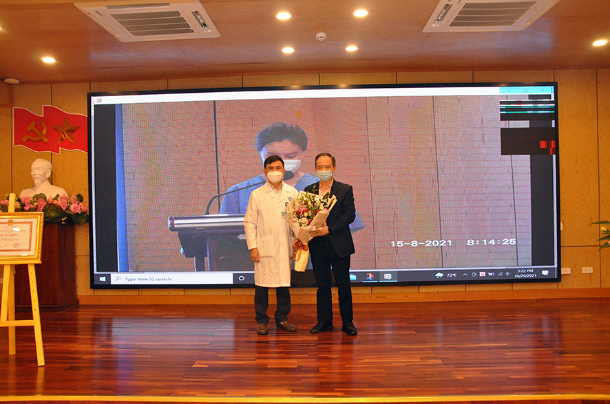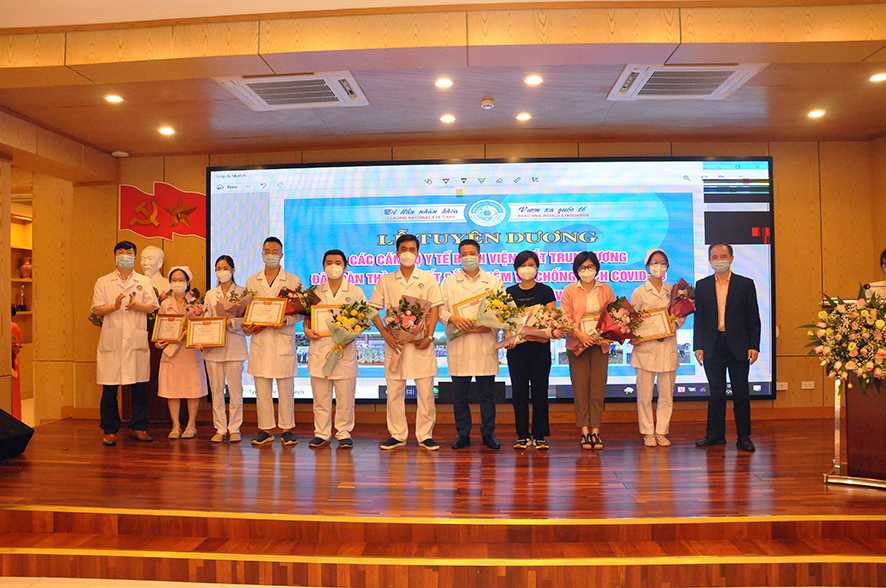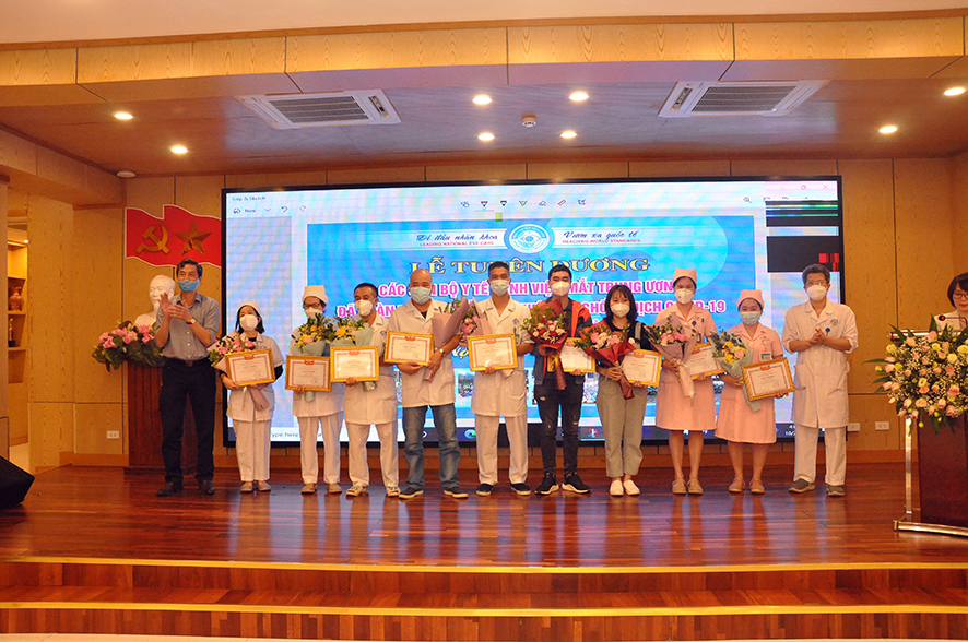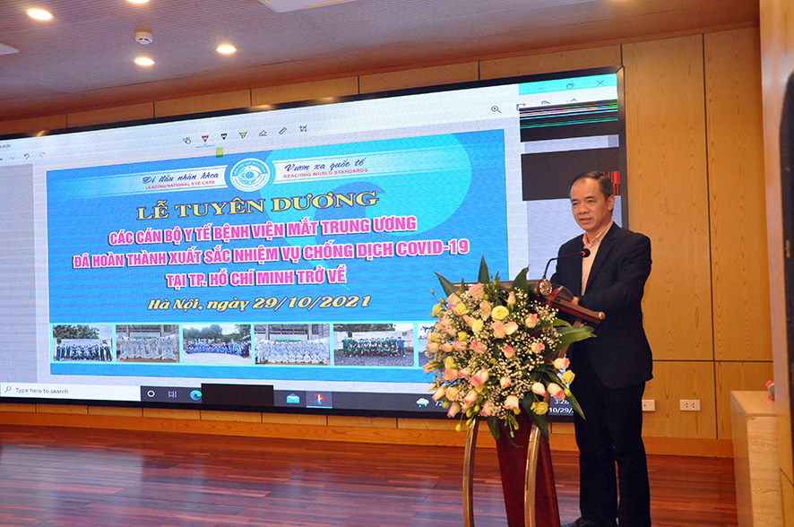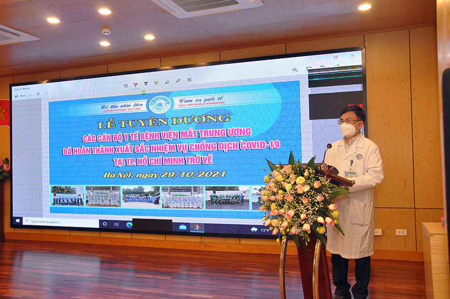 Tại buổi lễ, PGS.TS Nguyễn Xuân Hiệp - Bí thư Đảng ủy, Giám đốc Bệnh viện Mắt Trung ương không giấu được sự xúc động, tự hào và vui mừng khi thấy tất cả các thành viên của hai đoàn công tác đã hoàn thành xuất sắc nhiệm vụ do Bộ Y tế và bệnh viện giao, mạnh khỏe và an toàn trở về sau gần 2 tháng căng mình chạy đua với thời gian, cùng các đồng nghiệp các bệnh viện khác chung tay giành lại sự sống cho những bệnh nhân mắc COVID-19 tại bệnh viện dã chiến số 16 - một trong những nơi điều trị bệnh nhân trong tâm dịch nóng nhất của cả nước trong thời gian qua.