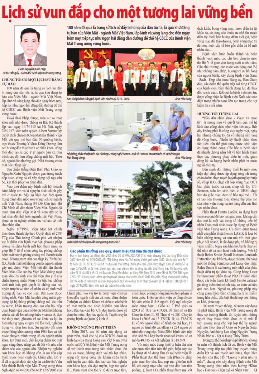 100 năm đã qua là trang sử lịch sử đầy bi hùng của dân tộc ta, là quá khứ đáng tự hào của Viện Mắt - ngành Mắt Việt Nam, lấp lánh và sáng lạng cho đến ngày hôm nay, tiếp tục như ngọn hải đăng dẫn đường để thế hệ CBCC của Bệnh viện Mắt Trung ương vững bước.