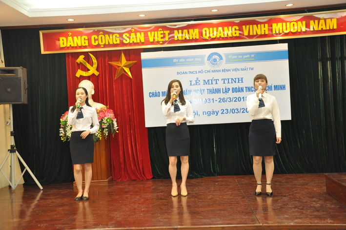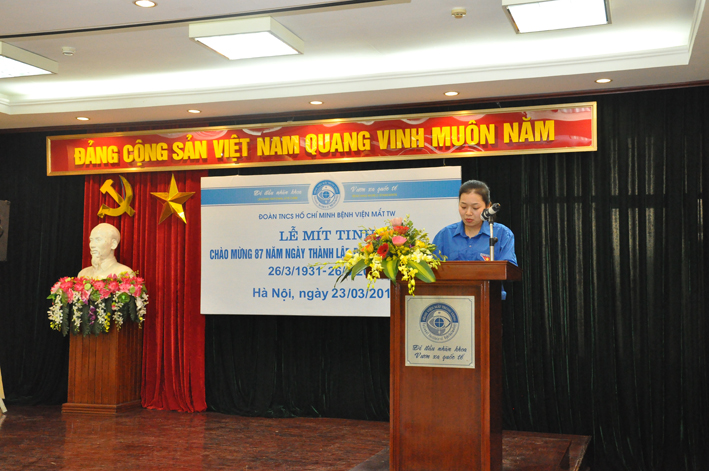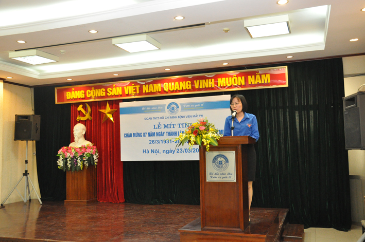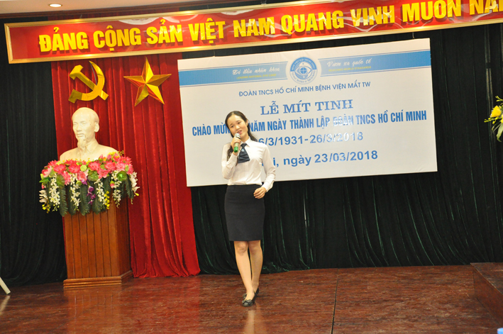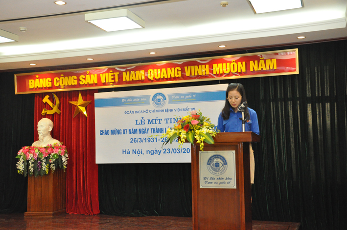 Tại buổi lễ,  bác sỹ Trần Thu Hương, Bí thư Đoàn TNCS HCM Bệnh viện Mắt TW cùng các đoàn viên thanh niên ôn lại những chặng đường lịch sử, những truyền thống vẻ vang cảu tổ chức Đoàn thanh niên dưới sự lãnh đạo của Đảng. Trong năm qua, góp phần với những thành tích chung của Bệnh viện Mắt TW, đặc biệt trong phong trào toàn đơn vị thi đua lập thành tích chào mừng 100 năm thành lập Bệnh viện (2917-2017), các đoàn viên thanh niên tham gia tích cực và có những đóng góp tích cực, tiêu biểu như phong trào hiến tặng giác mạc, hiến máu, đổi mới trong phong cách phục vụ người bệnh, hoạt động tình nguyện....Đặc biệt trong phong trào nghiên cứu khoa học, nhiều đoàn viên thanh niên không ngừng nỗ lực và có những thành tích khoa học, đạt nhiều giải cao tại các cuộc thi sáng tạo tuổi trẻ trong nước và tham dự nhiều diễn đàn khoa học quốc tế. Năm 2017, Đoàn thanh niên Bệnh viện Mắt TW có 1 công trình nghiên cứu khoa học được tuyển chọn trong tổng số 25 công trình nghiên cứu tiêu biểu tại Festival tuổi trẻ sáng tạo toàn quốc.