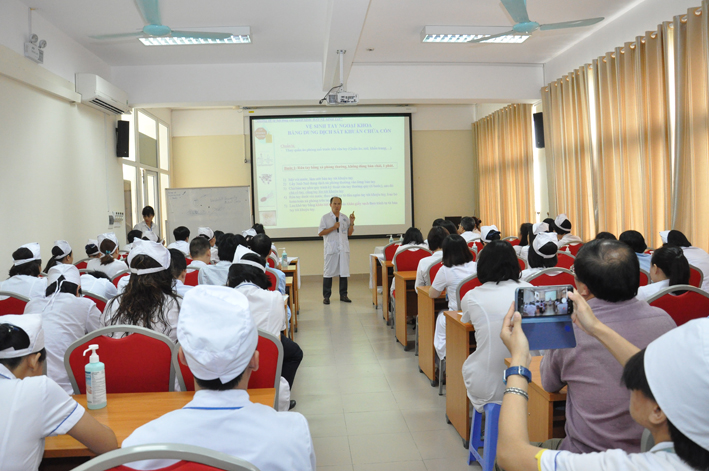 Trong hơn 1 giờ, BS.TS Nguyễn Văn Hiếu trưởng khoa Chống nhiễm khuẩn, chuyên gia của Hội đồng Kiểm soát nhiễm khuẩn Bộ Y tế đã cung cấp cho học viên những thông tin mới nhất về tình hình dịch bệnh, kiến thức về chẩn đoán, điều trị, phòng chống và kiểm soát bệnh, đường lây và các biện pháp phòng ngừa dịch nhằm phát hiện sớm từ ca bệnh đầu tiên, cách ly và điều trị kịp thời, hướng dẫn giám sát, thu thập mẫu, bảo quản và vận chuyển bệnh phẩm nghi nhiễm nCoV. Các học viên sau đại học, nhân viên nhà ăn, bảo vệ và nhiều người nhà bệnh nhân quan tâm cũng dự thính rất nghiêm túc.