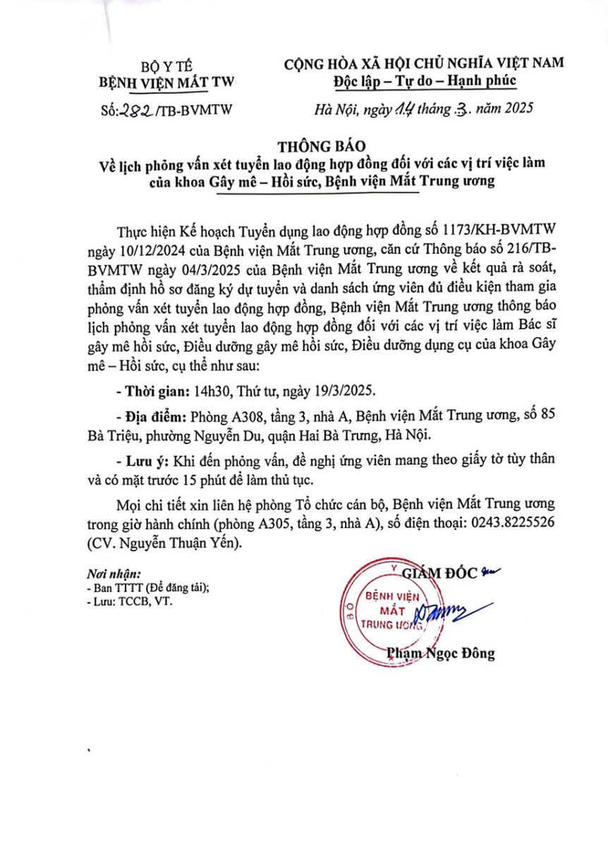 Thực hiện kế hoạch tuyển dụng lao động hợp đồng số 1173/KH-BVMTW ngày 10/12/2024 của Bệnh viện Mắt Trung ương, căn cứ thông báo số 216/TB-BVMTW ngày 04/3/2025 của Bệnh viện Mắt Trung ương về kết quả rà soát, thẩm định hồ sơ đăng ký dự tuyển và danh sách ứng viên đủ điều kiện tham gia phỏng vấn xét tuyển lao động hợp đồng, Bệnh viện Mắt Trung ương thông báo lịch phỏng vấn xét tuyển lao động hợp đồng đối với các vị trí việc làm bác sĩ gây mê hồi sức, điều dưỡng gây mê hồi sức, điều dưỡng dụng cụ khoa Gây mê - Hòi sức.